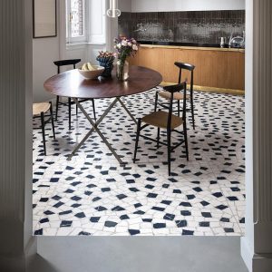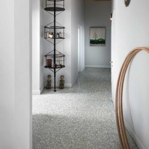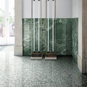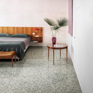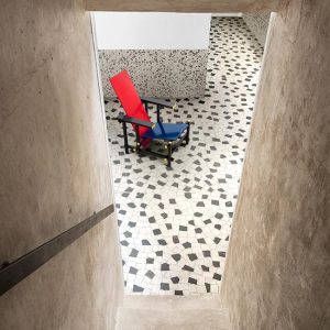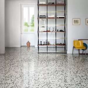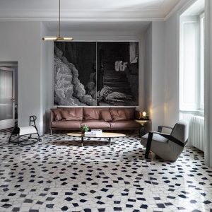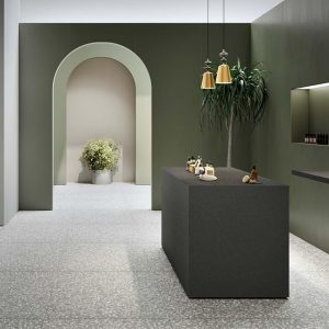 Ghiara offers 3 different interpretations of Terrazzo: Palladiana, with extra-large black and white fragments, Calcina, in which the cement base predominates over the fragments, and finally Minuta, in which the pebbles are tiny (“minute”) and very densely packed. All variants Minutaand Calcina are available in two rectified sizes, 120×120 cm and 60×120 cm in slimline thickness – 6 mm – and in two different surfaces, natural and glossy, Palladiana only in size 120×120 cm 6mm Nat and Lux. In the natural version, the fragments are slightly polished to underline the contrast with the substrate, for a natural, slightly threedimensional effect.